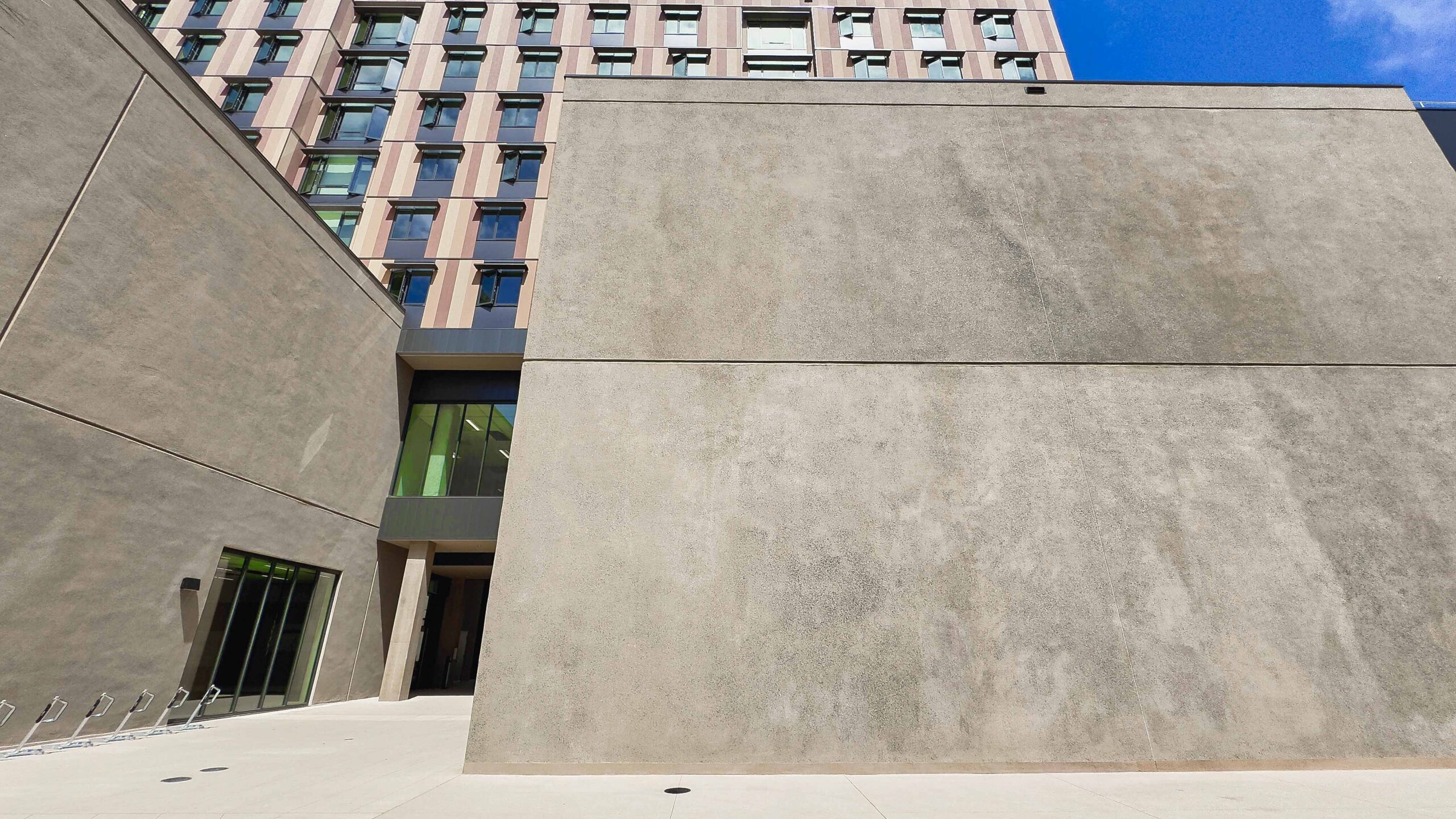 The University of California San Diego (UCSD) initially specified integral color cast-in-place concrete walls with a sandblast finish for its upcoming housing development. However, upon evaluating the costs, the project exceeded the budget.